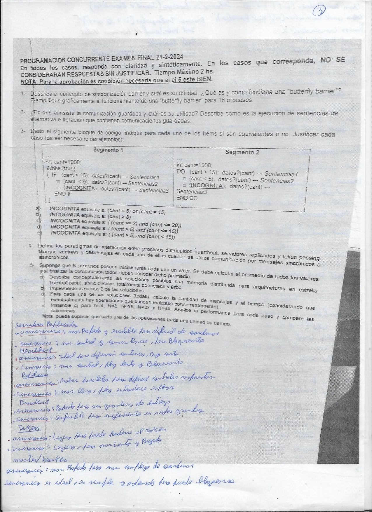 3- Defina los paradigmas de interacción entre procesos distribuidos token passing, servidores replicados y prueba-eco. Marque ventajas y desventajas en cada uno de ellos cuando se utiliza comunicación por mensajes sincrónicos o asincrónicos.